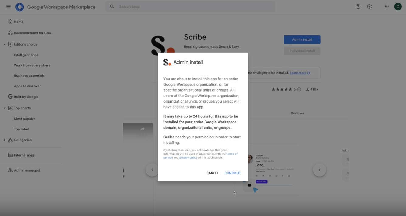 In the signature tab select the Google Workspace option then click on "**Install Scribe app".** in the right panel.&#x20;
